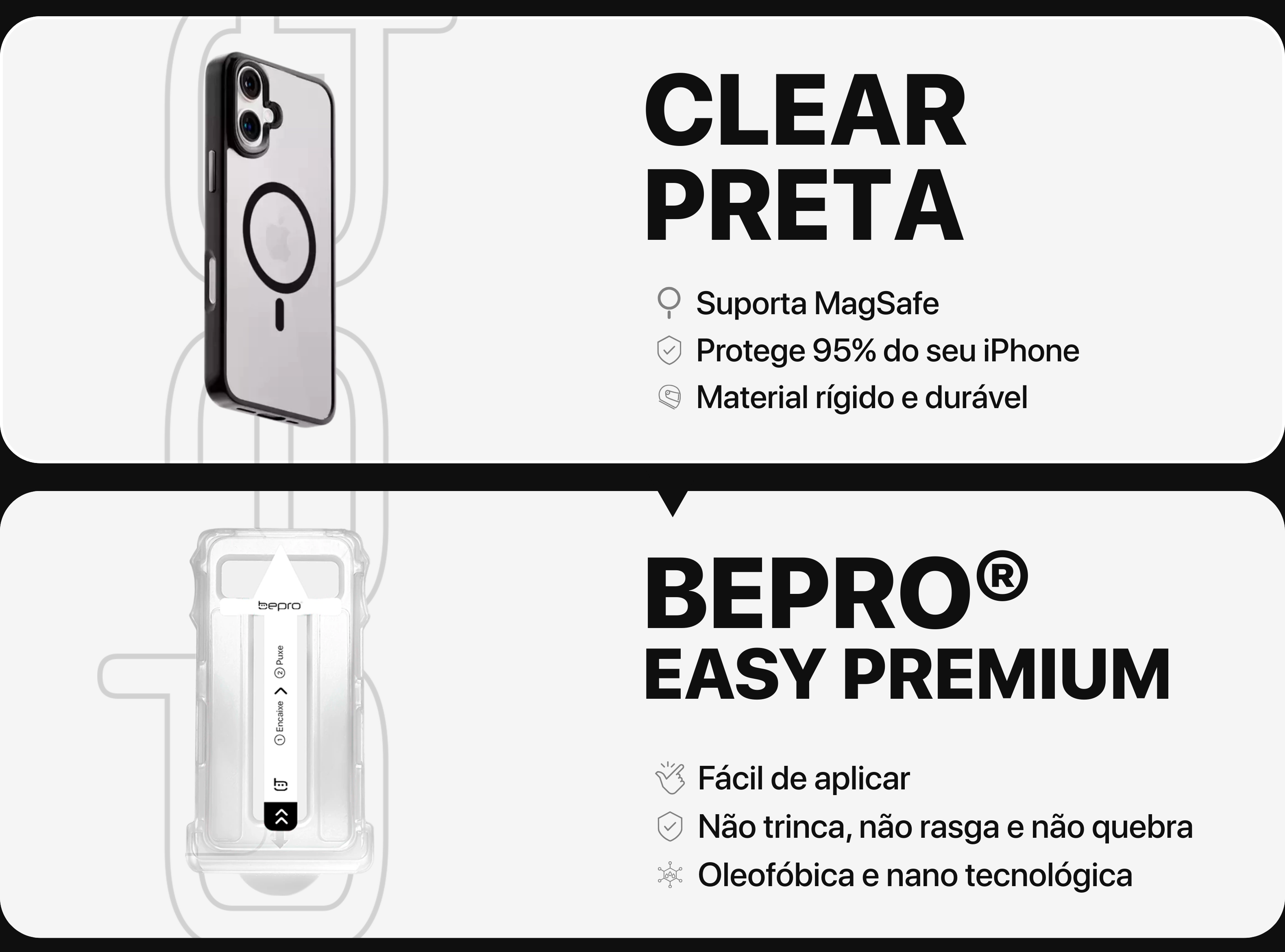 O Combo Essencial BePro® reúne a proteção avançada da película Easy Premium com o design clean e sofisticado da capa MagSafe® Clear, garantindo segurança e estilo para o seu iPhone.