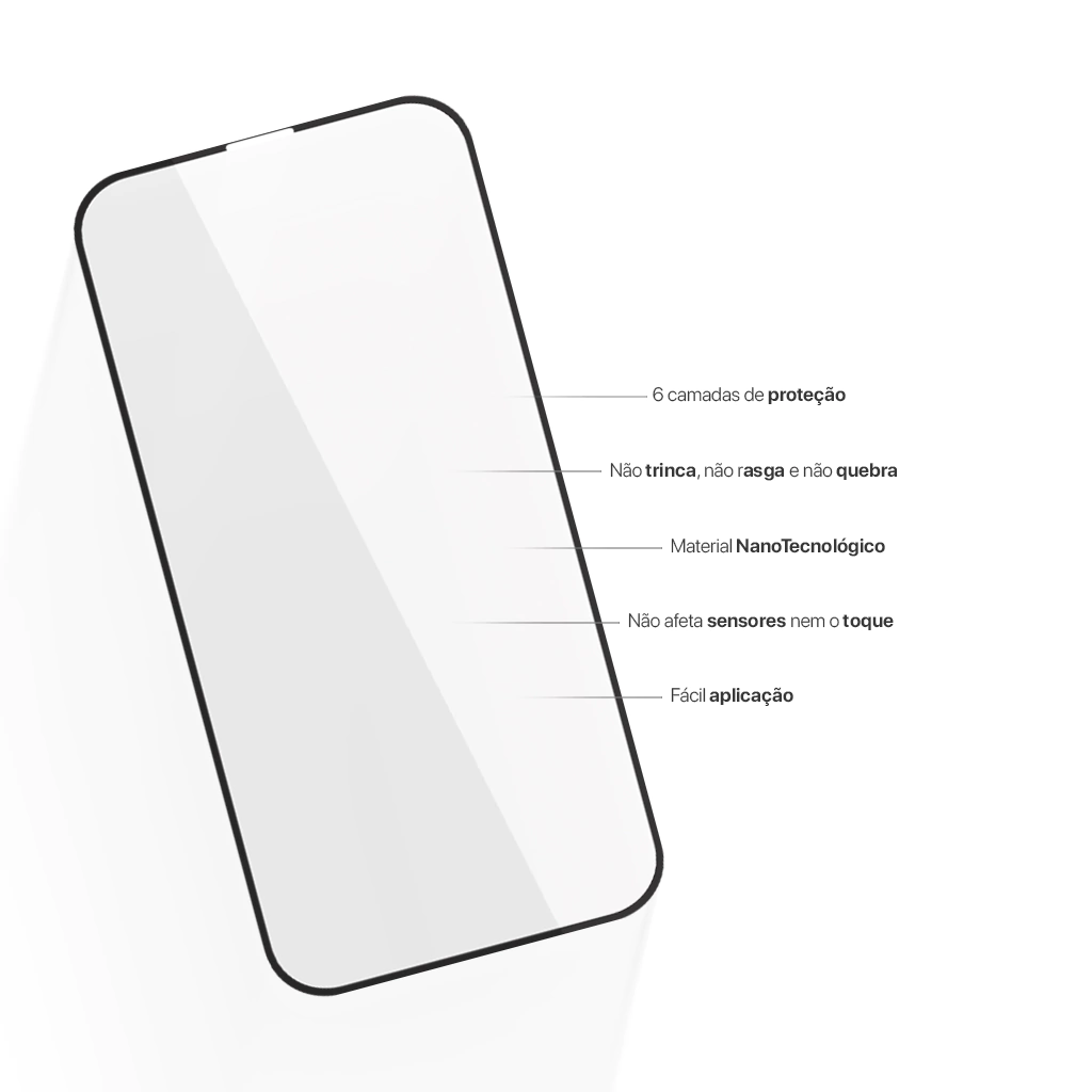 Ela cobre 99,9% da tela do seu iPhone e não interfere na sensibilidade ao toque ou na qualidade da câmera frontal.